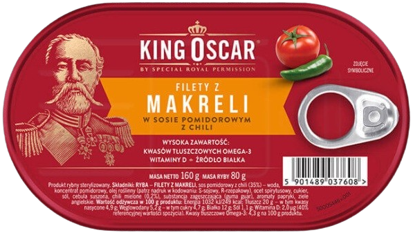 PLN https://en.dodomku.pl/King_Oscar_Herring_fillets_in_tomato_sauce_pomidorowym/106854.htmlRYBA - FILETY Z MAKRELI, sos pomidorowy z curry (35 %) - woda, koncentrat pomidorowy, olej roślinny (patrz nadruk w kodowaniu: S-sojowy, R-rzepakowy), cukier, curry (0,8 %), s(...)