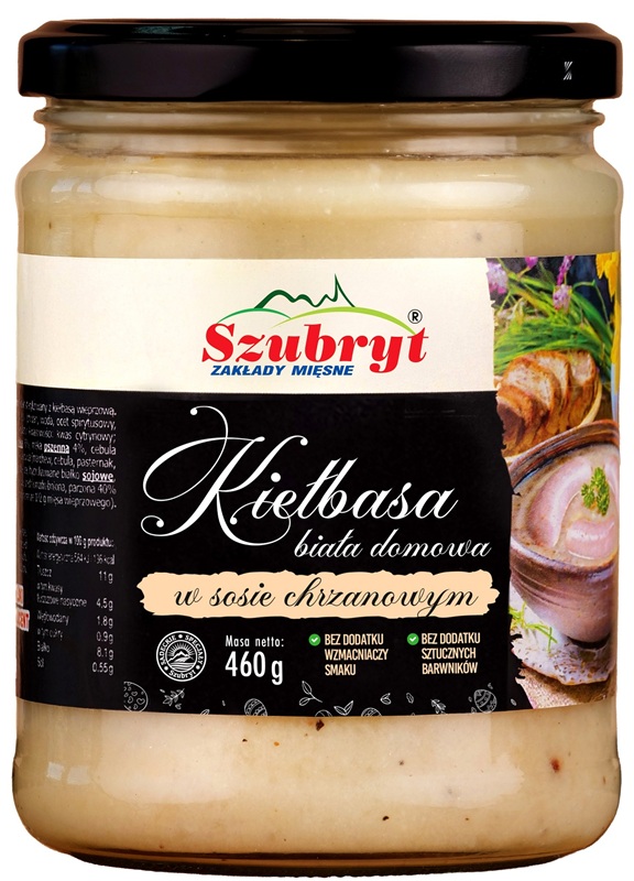 Sos chrzanowy 60% [woda, chrzan tarty 10% (chrzan, woda, ocet spirytusowy, cukier, mleko w proszku, sól, olej rzepakowy, regulator kwasowości: kwas cytrynowy; substancja konserwująca: E223), śmietana (z mleka ) 6%, mąka pszenna 4%, cebula smażona, tłuszcz w ieprzowy, przyprawy, sól, suszone warzywa (marchew, cebula, pasternak, pietruszka, lubczyk, por), cukier, aromaty ( seler ), glukoza, hydrolizowane białko sojowe , barwnik: ryboflawina], kiełbasa biała domowa wieprzowa, średniorozdrobniona, parzona 40% (mięso wieprzowe, sól, przyprawy. 100 g produktu otrzymano ze 102 g mięsa wieprzowego) . Produkt może zawierać: Laktozę, jaja, gorczycę